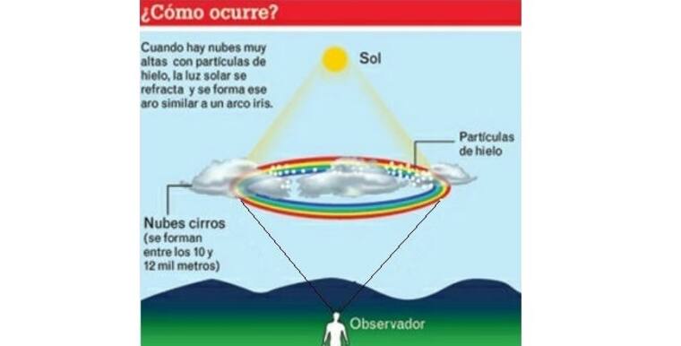 Según la Sociedad de Astronomía del Caribe (SAC), los halos solares se generan cuando la luz del sol pasa través de una fina capa de nubes, que por su gran altura contiene diminutos cristales de hielo.
