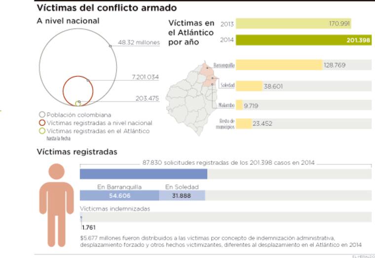 En el Atlántico hay registrados hoy 203.475 víctimas, de las cuales 128.769 residen en Barranquilla, 38.601 en Soledad, 9.719 en Malambo y el resto moran en los otros municipios del Departamento.