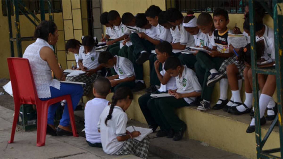 Las vacaciones de mitad de año aún no han llegado y los salones del Colegio Distrital Isaac Newton permanecen desocupados gran parte del tiempo. No obstante, los 750 estudiantes matriculados en la institución ubicada en el barrio El Bosque, asisten diariamente a recibir sus clases. Pero, en lugar de pupitres, los menores se 'acomodan' en las pequeñas graderías e, incluso, en el suelo del patio escolar.
