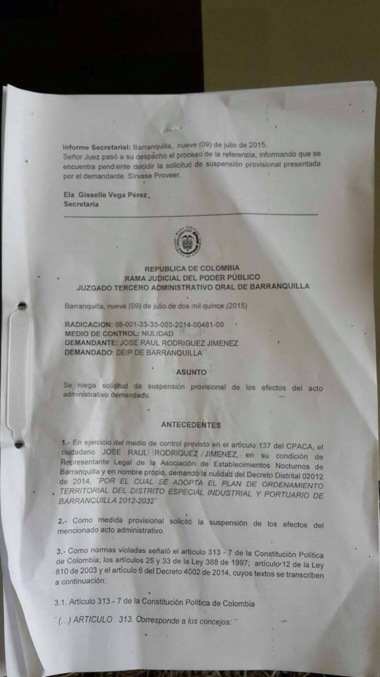 La demanda había sido interpuesta por José Raúl Rodríguez Jiménez, representante legal de la Asociación de Establecimientos Nocturnos de Barranquilla, 'en ejercicio del medio de control previsto en el Artículo 137 del CPACA'.