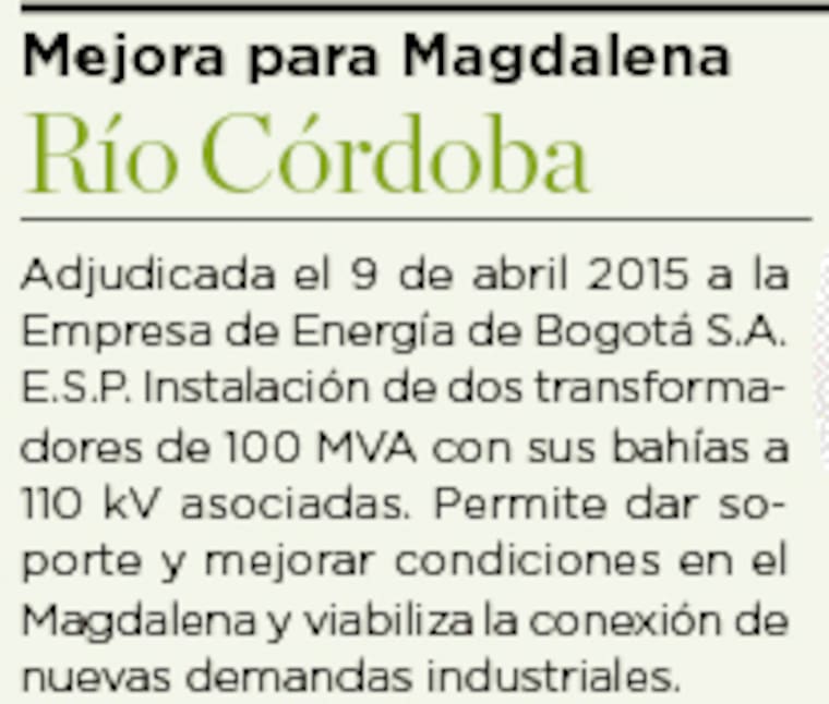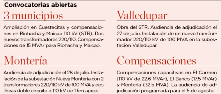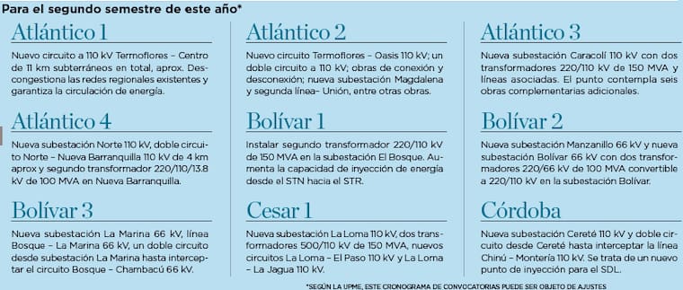 ESTADO DE LOS PROYECTOS. La primera fase del plan, que incluye los procesos licitatorios, está en marcha. De acuerdo con la UPME, de las obras del STR previstas para todo el litoral Atlántico, se han iniciado cinco convocatorias públicas: una de ellas ya fue adjudicada y la obra correspondiente servirá al Magdalena; las cuatro restantes se encuentran en proceso de selección, se adjudicarán entre julio y agosto del presente año y servirán a Atlántico, La Guajira, Cesar, Córdoba y Bolívar.