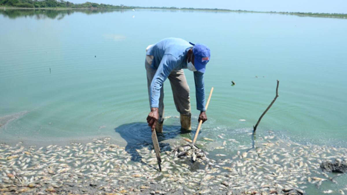 'Desde el domingo he recogido mojarra lora, mojarra peña, cachegua, coroncoro y raya, todo podrido', expresa Máximo, mientras camina por la orilla de la laguna.