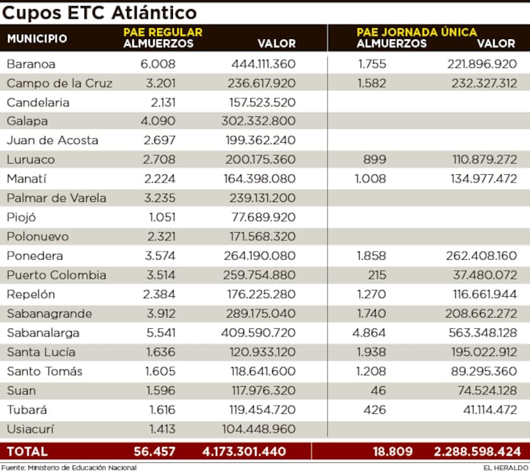 Con esto se garantizan 18.809 almuerzos y para el PAE regular en el Atlántico el aporte de la Nación es de $4.173.301.440, para un total de 56.457 almuerzos en 20 municipios (ver tabla).