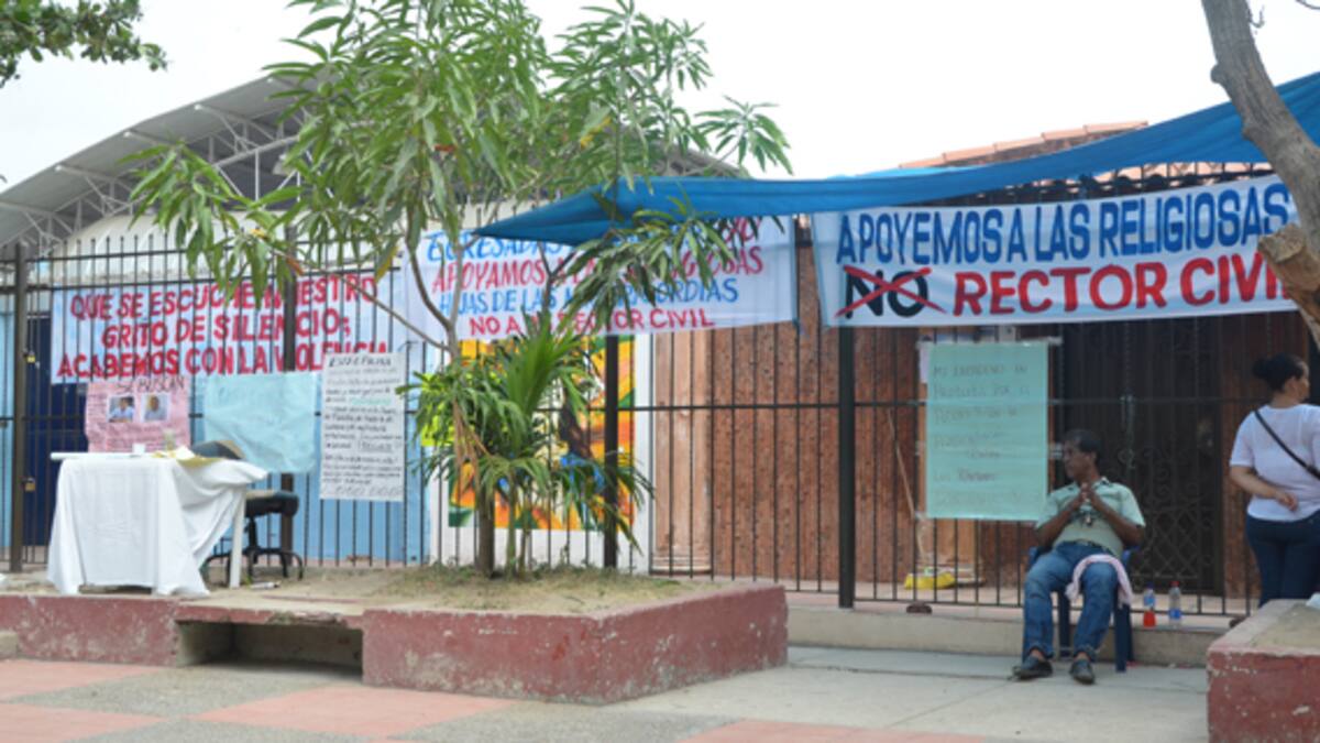 La entrada de la Institución Educativa Comercial Nuestra Señora de las Misericordias en Soledad, está forrada con carteles y pancartas alusivas al rechazo de cambio de la rectora religiosa por una docente que ganó un concurso de méritos.