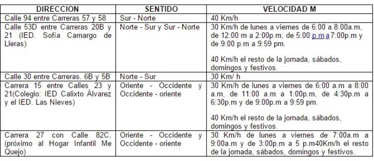Los puntos de fiscalización en donde comenzarán a emitirse sanciones son en la calle 94 entre carreras 57 y 58; el colegio Sofía Camargo de Lleras, ubicado en la calle 53D entre carreras 20B y 21, en ambos sentidos; calle 30 entre carreras 6B y 5B; carrera 15 entre calles 23 y 21, en los colegios Calixto Álvarez y Las Nieves, y en la carrera 27 con calle 82C.