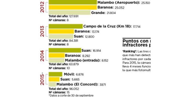 La instalación de equipos de fiscalización electrónica o fotomultas en carreteras del Departamento ha permitido ‘pillar’ a conductores que transitan a 'exceso de velocidad' en 322.023 ocasiones desde enero de 2012 hasta septiembre de este año. Las cifras fueron reveladas a EL HERALDO por el Instituto de Tránsito del Atlántico (ITA), que actualmente tiene 14 cámaras fijas en vías como la Oriental, Cordialidad y Vía al Mar, y un equipo adicional que es móvil (un vehículo con cámara).