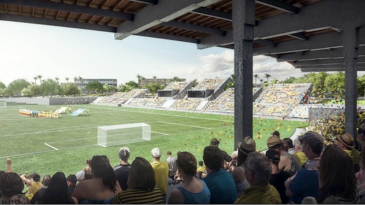 Render de la vista panorámica del estadio Romelio Martínez, donde se contemplan zonas verdes.