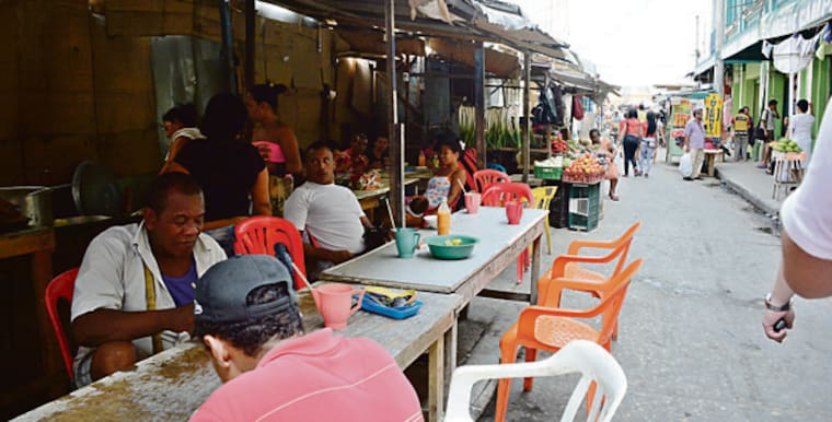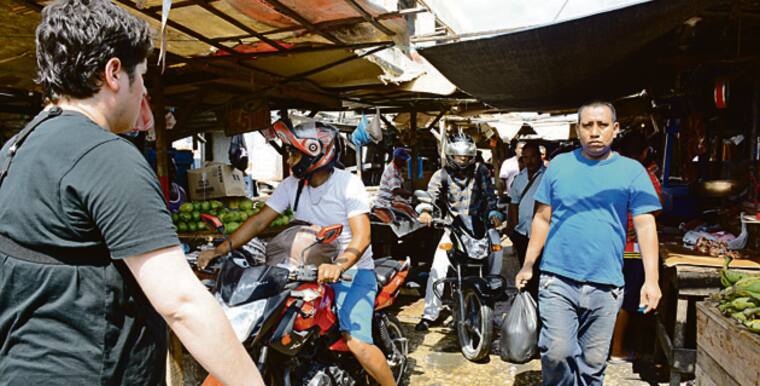 Ya en la calle real, una verdadera ‘selva’ infernal de cemento, malos olores y comercio informal sale a nuestro paso, donde encontramos que por el angosto espacio central apenas logran pasar tres personas juntas. Allí había carretillas a ambos lados de la vía, en las que venden frutas, pescado y diferentes tipos de carnes al aire libre. Todo en precarias condiciones higiénicas. En el trayecto también fue necesario esquivar motos y ‘bicitaxis’ parqueadas.