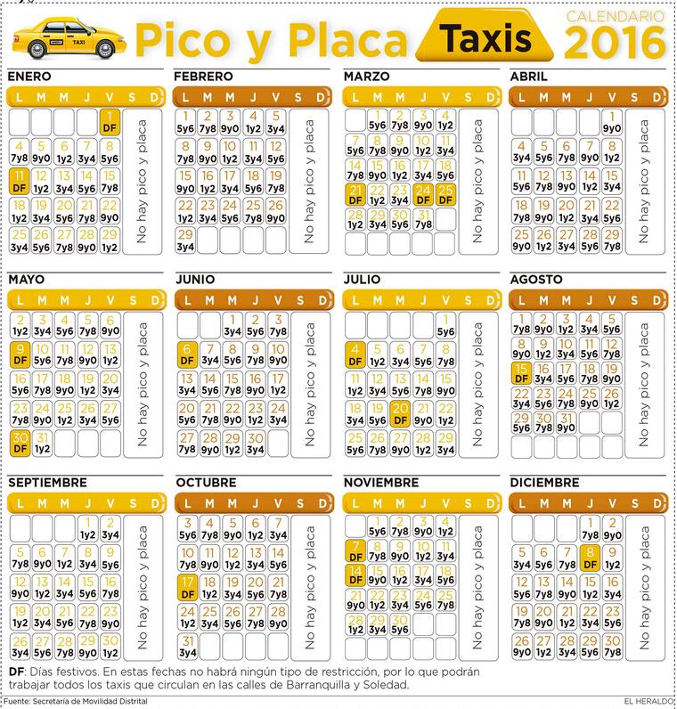 El calendario oficial con el cronograma (ver infografía) por el cual se deberán regir los propietarios y conductores de taxis que circulan en Barranquilla será socializado a través de los medios de comunicación, redes sociales, las empresas de taxis y estará publicado en la página web www.barranquilla.gov.co/movilidad y diariamente en la cuenta Twitter @Movilidad_BAQ, según informó la dependencia en un comunicado.