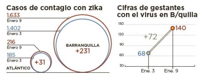 En el departamento. Atlántico registra 128 casos más de zika entre las dos primeras semanas del año, según información del INS. Esta cifra equivale a un incremento del 22% de los pacientes que presentaron síntomas de la enfermedad por picaduras del mosquito Aedes Aegypti.