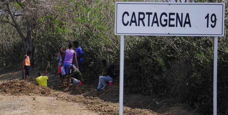 Cartel que indica cuánto falta desde Arroyo de Piedra a Cartagena. En el fondo, un grupo de ‘mineros’ descansa.