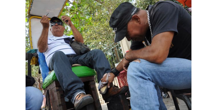 Enrolla en los dedos índice y medio de su mano derecha un pedazo de trapo con el que complementa la labor de la pasta lustradora y sus cepillos. La rapidez de sus movimientos evidencia el dominio del oficio y, después de ocho minutos, los zapatos de su asiduo visitante lucen impecables.