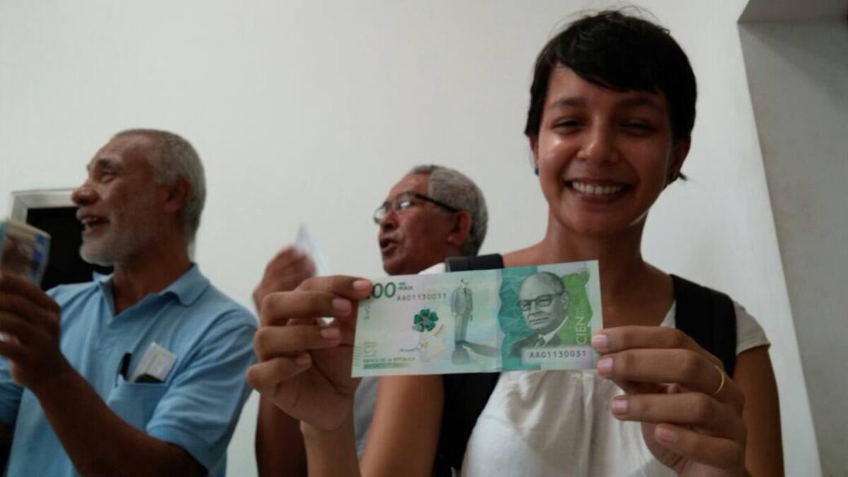 'No había dimensionado la emoción que se siente, pero comencé a escuchar a la gente decir que querían ser los primeros en obtenerlo y me dirigí hoy hasta aquí, me tocó esperar, pero no importa, tuve el primer billete de $100 mil en la ciudad', manifestó la joven que llevó una libreta para guardarlo y evitar que se arrugara.