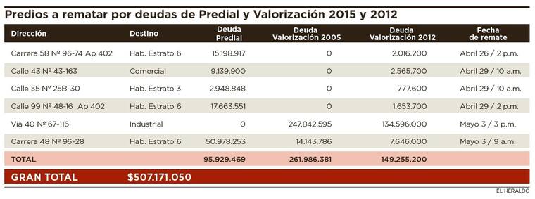 La deuda de los seis predios por concepto del Predial de 2015 y años anteriores es de 96 millones de pesos; 262 millones de pesos en Valorización 2005 y 150 millones de pesos en Valorización 2012.