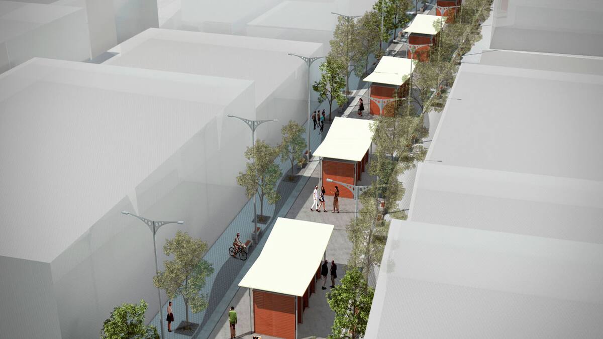 La propuesta consiste en instalar los módulos en el centro de cada una de las vías peatonales, luego de haber sido intervenidas en cuanto a instalación subterránea de redes de servicios públicos, alcantarillado pluvial, iluminación LED y elementos de paisajismo.