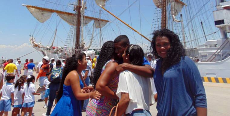 La embarcación fue recibida en medio de una ceremonia militar, con la asistencia de autoridades militares, de Policía, civiles y los familiares de los 78 marinos en formación quienes participaron en la segunda fase del crucero, que zarpó de Santa Marta rumbo a la ciudad de Castries, capital de la isla Santa Lucía, ubicada en el Caribe.