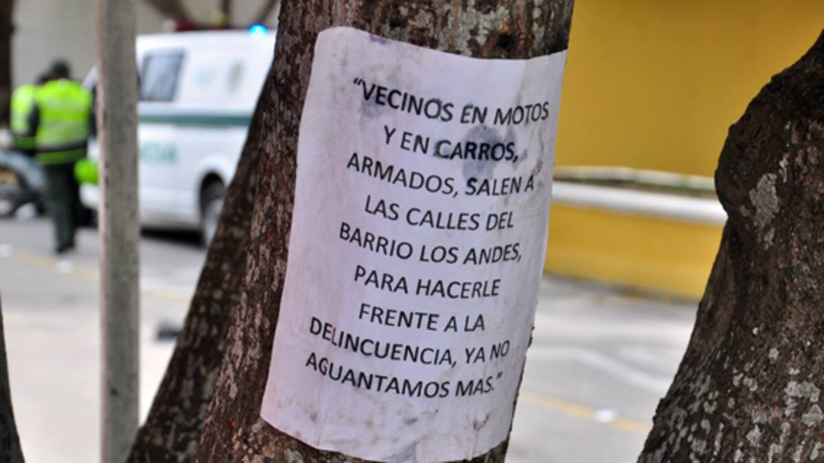 Unos metros hacia el andén, en el tronco de un árbol, un panfleto informa que vecinos en motos y carros recorren armados las calles del barrio para 'hacerle frente a la delincuencia'. Un par de metros más adelante, en un poste de energía, otro papel informa que los habitantes del barrio están 'presos en sus casas' porque temen que, al salir de estas, 'delincuentes en moto y armados' los atraquen.