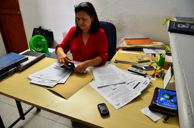 Lo primero que salta a la vista en el escritorio de la secretaria es que trabaja con máquina de escribir. 'Lo que tenemos son bastante antiguas, están un poco dañadas. El escritorio que uso es de la inspectora, que me lo trajo, y no tiene gavetas. Aquí ni contamos con aire acondicionado en la recepción', expresa la mujer, quien lleva siete años realizando sus labores de lunes a viernes.
