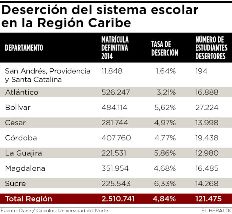 El primer lugar de la tabla lo ocupa Sucre, con 14.628 estudiantes que se han retirado de la escuela y una tasa de deserción de 6,33%. Luego aparece La Guajira, con 12.980 alumnos desertores y una tasa de deserción de (5,86%). En la tercera casilla está Bolívar, con 27.224 desertores (5,62%).