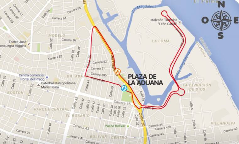 El recorrido se iniciará a las 8:00 de la noche en este punto, subirá por la carrera 50 hasta la calle 45, girará a la derecha hasta la carrera 50B, cruzará a la derecha en la calle 44, doblará a la izquierda por la carrera 50, girará a la derecha por la Vía 40, doblará a la izquierda por la carrera 46 hasta la rotonda de la calle 6- Avenida al Rio, hasta el retorno en la glorieta, cruzará a la derecha por la calle 6 hasta la vía 40, cruzará a la derecha hasta el estadio Tomas Arrieta, girará a la izquierda para retomar a la vía 40 hasta la glorieta del par vial de la carrera 50, girará a la derecha para llegar a la Plaza de la Aduana donde finalizará.
