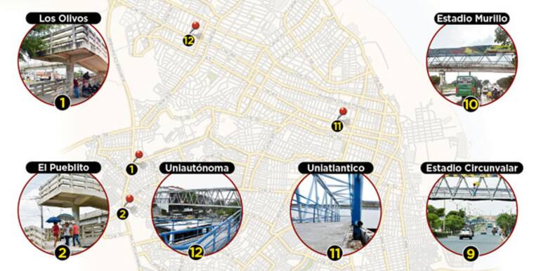 Según un inventario de la secretaría de Movilidad del Distrito, Barranquilla tiene 12 puentes peatonales. Algunos en buen estado y otros con corrosión y en sus alrededores con malezas. (Ver infografía)