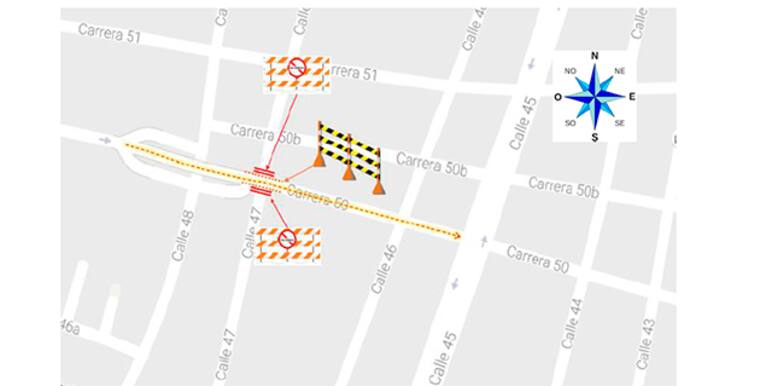 Por los trabajos de instalación de tuberías ejecutados por la empresa Triple A, se ha programado el cierre total de las bocacalles norte y sur de la Calle 47 a la altura de la Carrera 50, a partir de las 6:00 am hasta las 7:00 pm.
