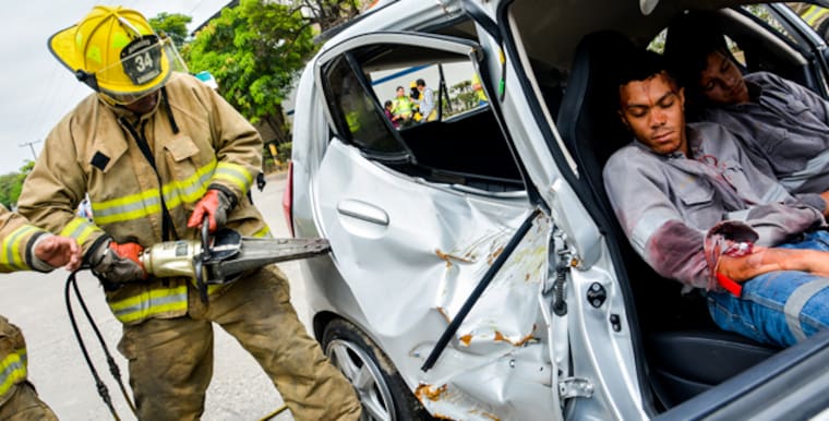 Momento en que simulan la destrucción de un vehículo para rescatar a Cristian Barreto y Andrés Rocha.