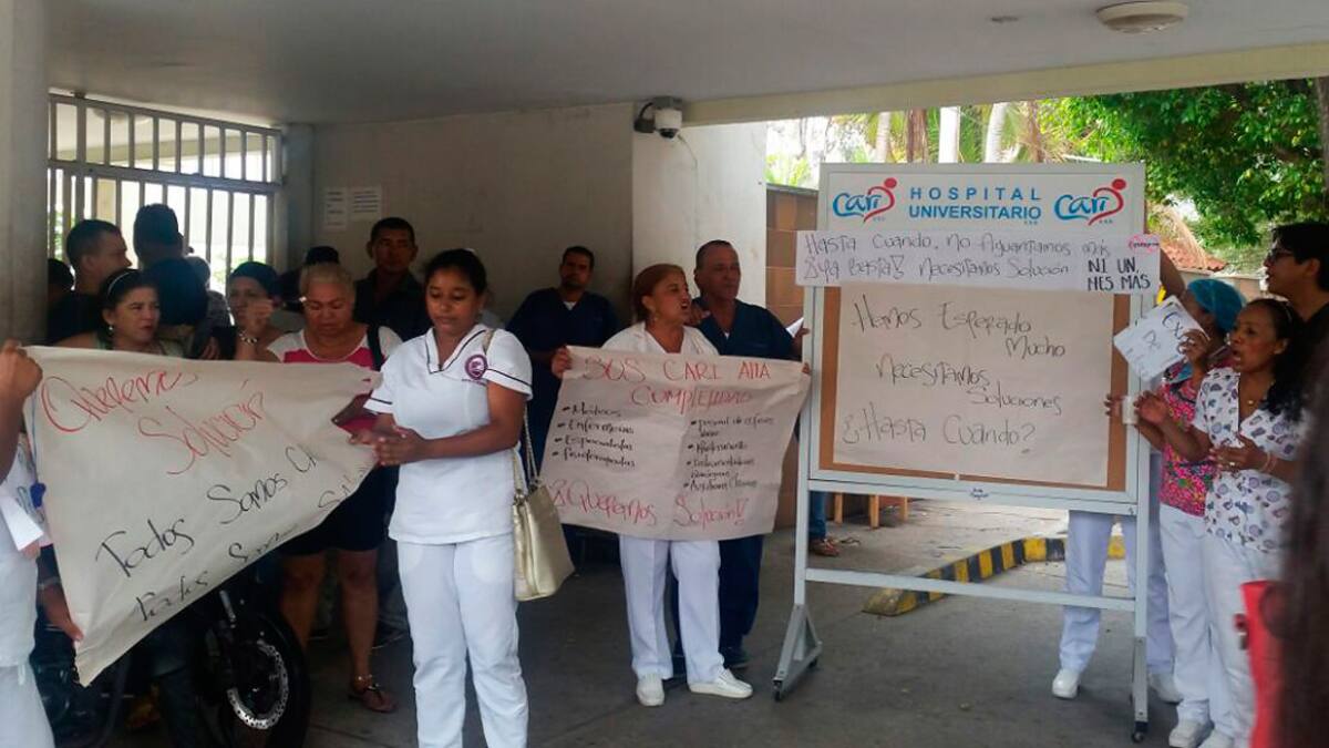 Al menos 30 miembros del equipo médico del Hospital Universitario Cari ESE protestaron ayer por el no pago de los últimos siete meses de salario por parte de la entidad.
