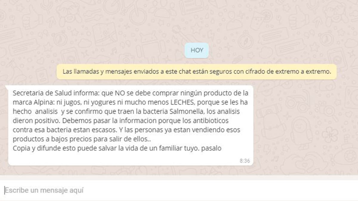 'Secretaria de Salud informa: que NO se debe comprar ningún producto de la marca Alpina: ni jugos, ni yogures ni mucho menos LECHES, porque se les ha hecho análisis y se confirmó que traen la bacteria Salmonella, los análisis dieron positivo. Debemos pasar la información porque los antibióticos contra esa bacteria están escasos y las personas ya estan vendiendo esos productos a bajos precios para salir de ellos... Copia y difunde esto puede salvar la vida de un familiar tuyo. Pasalo', se indica en los chats.