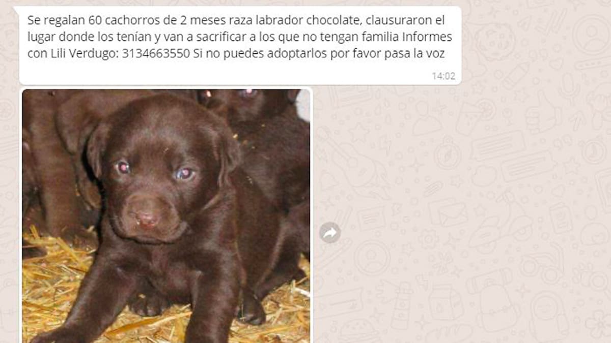 Durante la última semana circula en WhatsApp un mensaje en el que se advierte que 60 cachorros de la raza labrador chocolate serán sacrificados en caso de no ser adoptados pues la veterinaria donde residían será clausurada.
