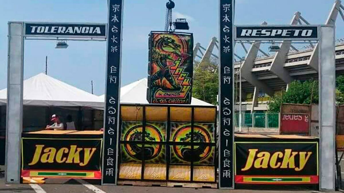 ‘Jacky en Concierto’ es un coloso de ocho bajos que agrupados conforman el logo del videojuego Mortal Kombat. La máquina principal repite la misma imagen y la acompaña ‘Scorpion’, uno de los personajes del clásico de Arcade y Super Nintendo. El nombre del sistema de sonido se destaca en colores neón. A los lados, el aparato lleva inscrito el lema que su dueño, Joaquín Cervantes Rojano, eligió: 'Tolerancia y Respeto'.