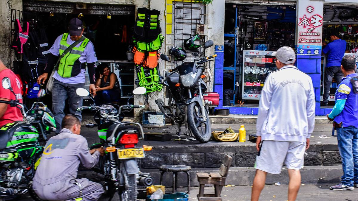 En el andén cambian llantas, desarman motocicletas y realizan otras maniobras dentro de la actividad de reparación. Los transeúntes tienen que bajar a la calle para poder transitar por esa zona.