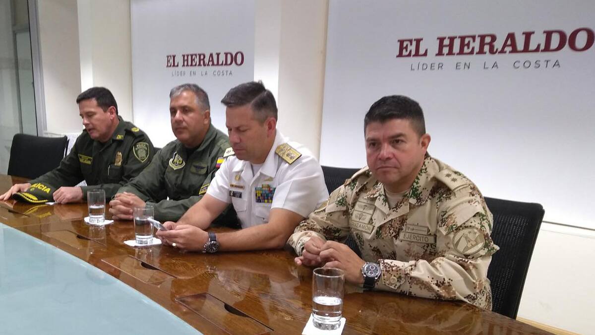 El general Jairo Leguizamón Rivas, comandante de la Segunda Brigada; el coronel Álvaro Pino, jefe del Comando Aéreo y de Combate No. 3 de la Fuerza Aérea; el almirante Juan Ricardo Rozo, director de la Escuela Naval de Suboficiales y el coronel Engelbert Grijalba, subcomandante de la Policía Metropolitana de Barranquilla, entregaron detalles sobre la iniciativa, en visita a esta casa periodística este jueves.