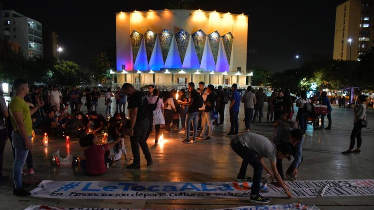 Con una ‘velatón’ en la Plaza de la Paz, estudiantes de la Universidad del Atlántico protestaron en contra del Gobierno nacional para exigirle que aumente los recursos para la base presupuestal de las instituciones de educación superior en el país.
