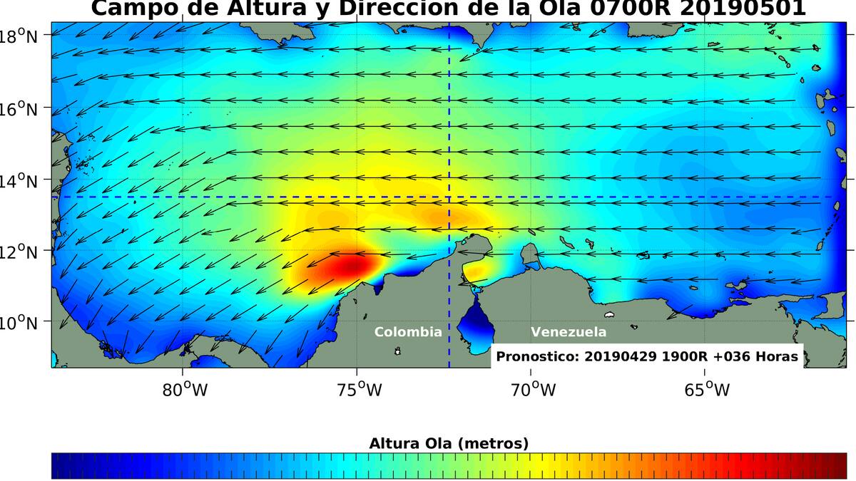Según el informe entregado por el Centro, los vientos irán de moderados a fuertes en el mar caribe colombiano y serán generados principalmente por la interacción del sistema de alta presión posicionado en el centro del océano Atlántico (1028 mbar) y el sistema de baja presión (1008 mbar) ubicado en el centro del litoral caribe colombiano.