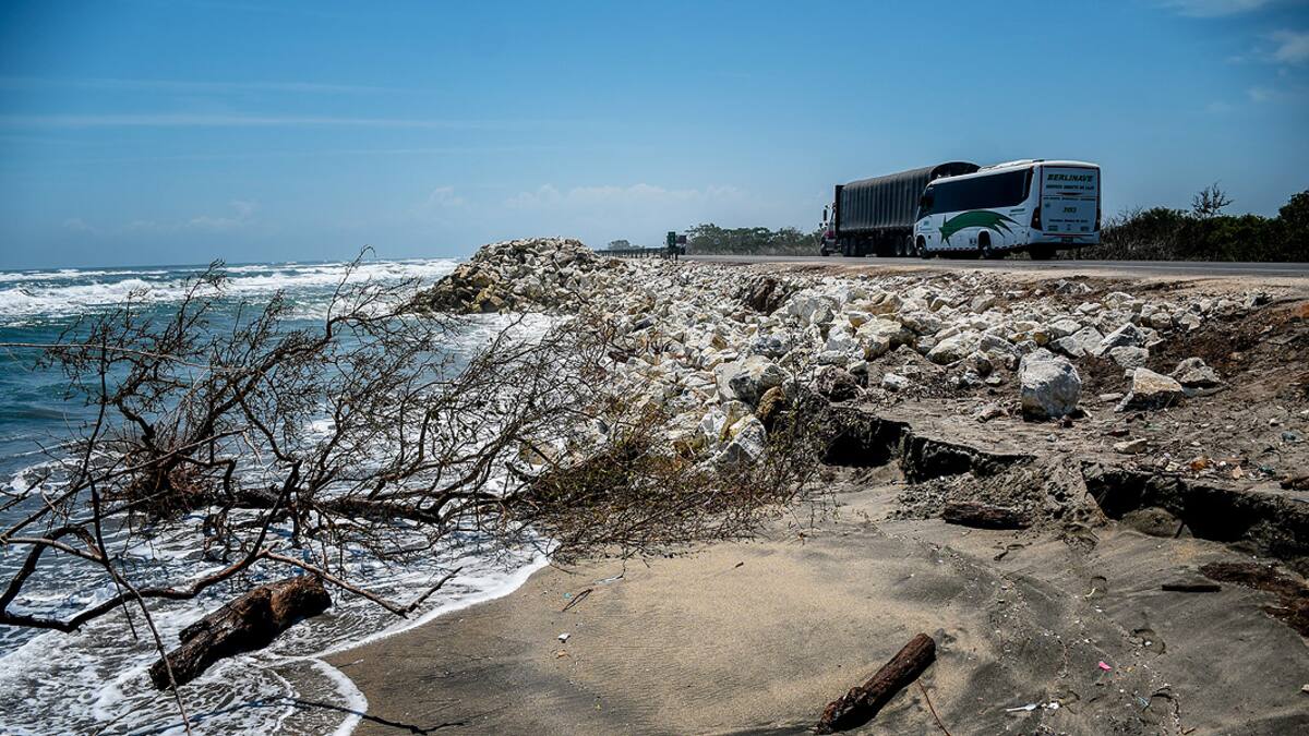 El mar no le da tregua a la vía Barranquilla- Ciénaga. Desde hace un par de meses varios tramos de los kilómetros 17 y 18 de la Troncal del Caribe se han visto afectados con la erosión costera, lo que amenaza con derrumbar parte de la carretera interdepartamental, según usuarios de la vía.