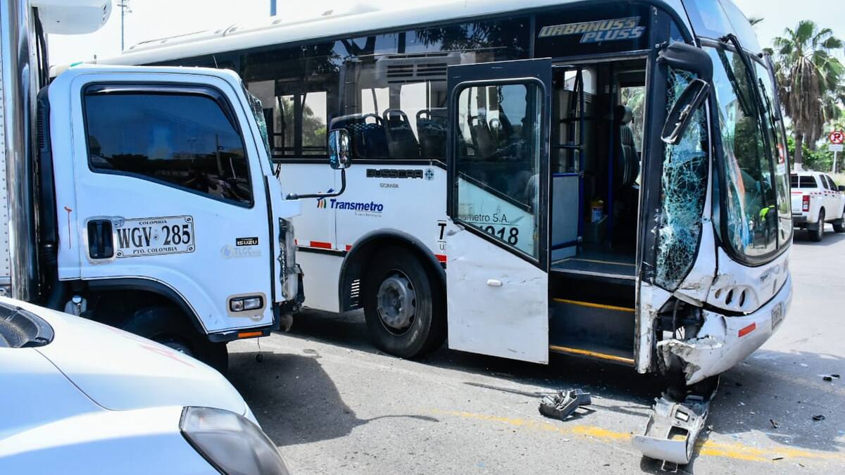 Un accidente de tránsito se presentó en la mañana de este domingo en la carrera 46 con calle 30, luego de que un furgón colisionara con la parte lateral de un articulado de Transmetro que cubría la ruta S2 Portal de Soledad.