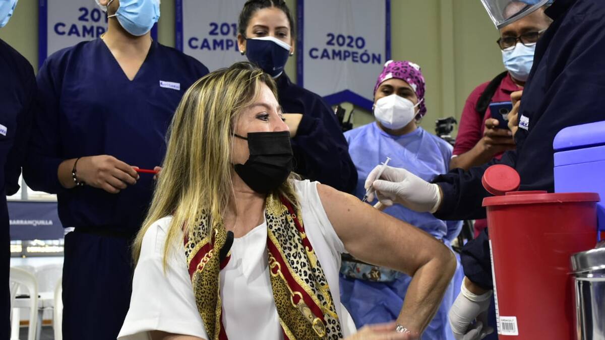 En la mañana de este jueves, el alcalde Jaime Pumarejo acompañó a su madre, Ingeborg Heins de Pumarejo, para recibir su vacuna contra la covid-19 en el coliseo Elias Chegwin.