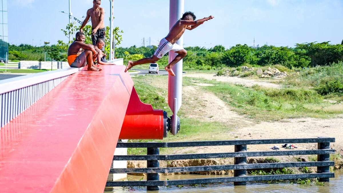 El recién inaugurado puente batiente ha sido convertido –por un grupo de jóvenes residentes en los barrios La Loma y La Bendición de Dios, entre otros– en un 'peligroso trampolín' para zambullirse a las aguas del Caño Las Compañías.
