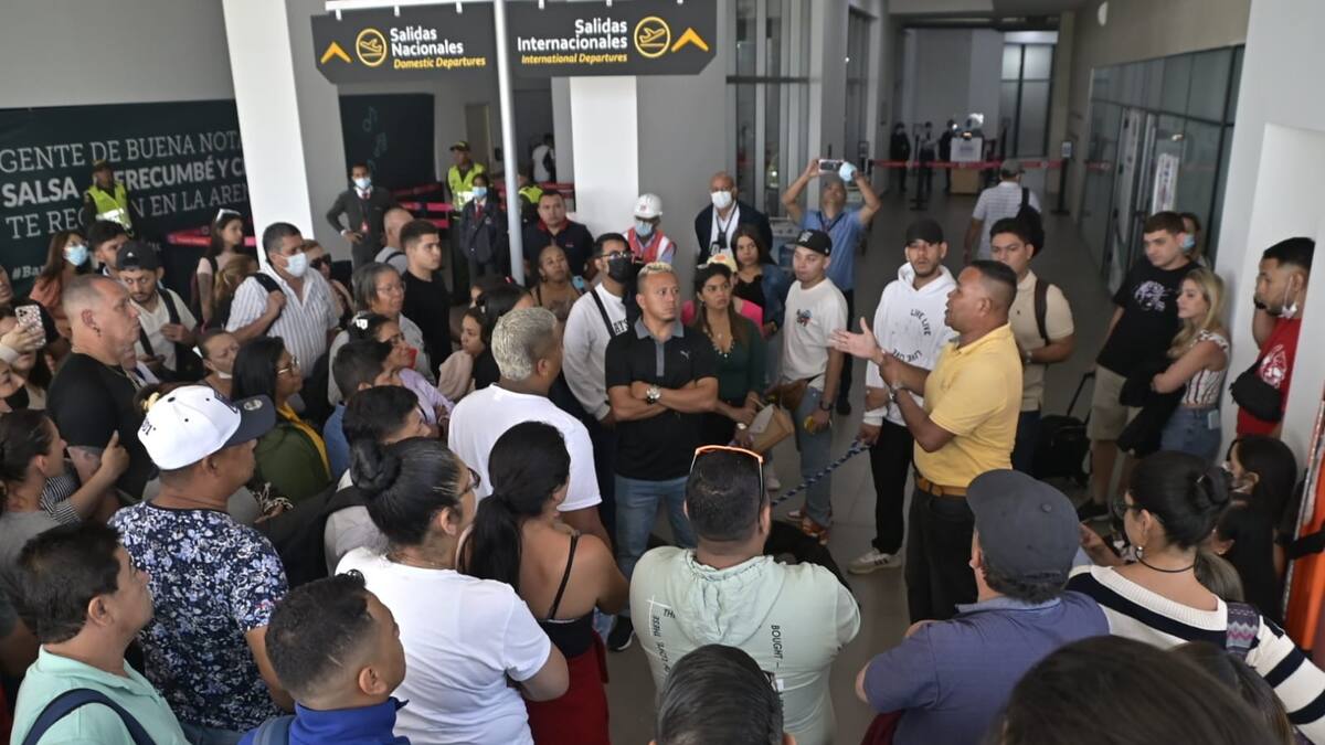 Rostros cansados es el reflejo de decenas de personas que aguardan desde hace muchas horas en el aeropuerto Ernesto Cortissoz de Barranquilla tras la suspensión de los vuelos a todo destino de la aerolínea Viva Air.