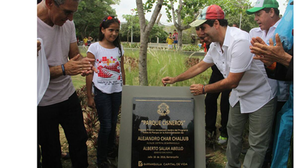 El acalde Alejandro Char inauguró este sábado el parque Cisneros, en la calle 68 entre carrera 64 y 65, en el norte de Barranquilla. 'Recuperamos el parque Cisneros, para la sana convivencia y recreación de todos mis amigos del barrio Santa Ana', expresó el mandatario de los barranquilleros a través de la red social Twitter, minutos antes del acto de entrega.