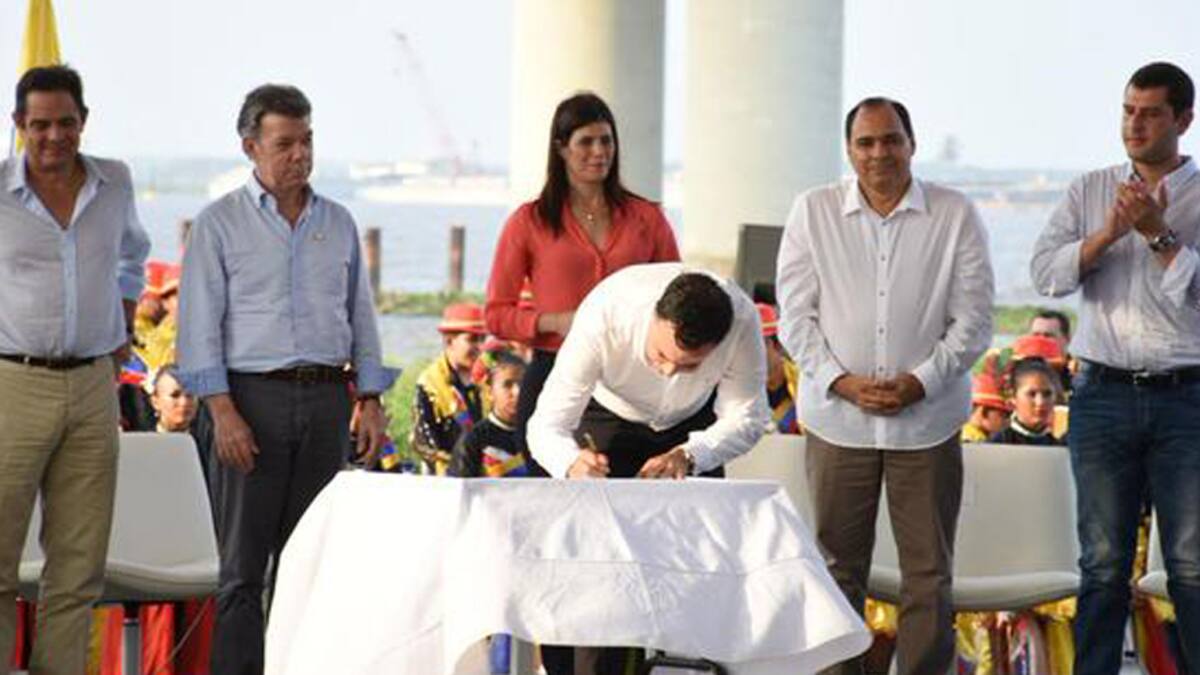 El actual Puente Pumarejo fue contratado por el entonces presidente Carlos Lleras Restrepo, 'abuelo de nuestro Vicepresidente, pero no alcanzó a inaugurarlo y ese honor le correspondió al presidente Misael Pastrana', que le puso el nombre de Laureano Gómez', dijo Santos.