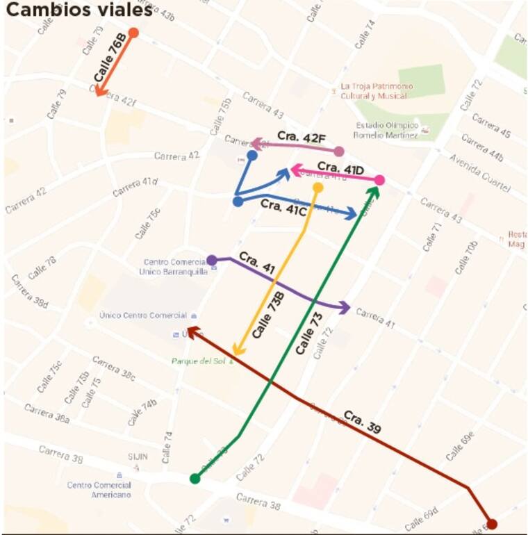 En relación con la carrera 41C entre calles 74 y 73, que también funciona en doble sentido, se convertirá en vía de una sola dirección, de occidente a oriente. De esta manera, quienes se desplacen por la carrera 41C, a la altura de la antigua sede del Colegio San José, podrán movilizarse solamente hacia el oriente de la capital atlanticense entre las calles 74 y 73.