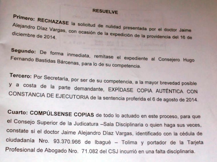 'En el caso concreto, se observa que el doctor Jaime Alejandro Díaz Vargas no tenía interés para solicitar la aclaración de la sentencia proferida por esta corporación, en cuanto no había sido reconocido como apoderado de una parte o de tercero interviniente en el proceso de la referencia y que, pese al pronunciamiento del 16 de diciembre del 2014 ha propiciado la dilación del procedimiento con la interposición de solicitudes e incidentes de nulidad improcedentes, lo que ha redundado en la situación descrita por el apoderado de la parte demandante en cuanto al cobro de la estampilla prohospitales de primer y segundo nivel de atención del departamento del Atlántico en el Distrito especial industrial y portuario de Barranquilla', se lee en el fallo conocido por EL HERALDO.