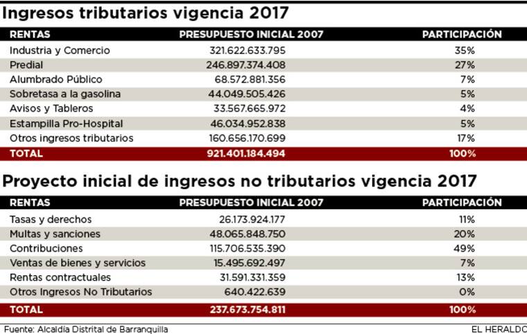 Los ingresos tributarios proyectados a recaudar durante la próxima vigencia fiscal están conformados por las rentas detalladas a continuación: Industria y Comercio, $321.622 millones; Predial, $246.897 millones; alumbrado público, $68.572 millones; sobretasa a la gasolina, $44.049 millones; estampilla pro-hospital, $46.034 millones; avisos y tableros, $33.567 millones, y otros ingresos tributarios, $160.656 millones.