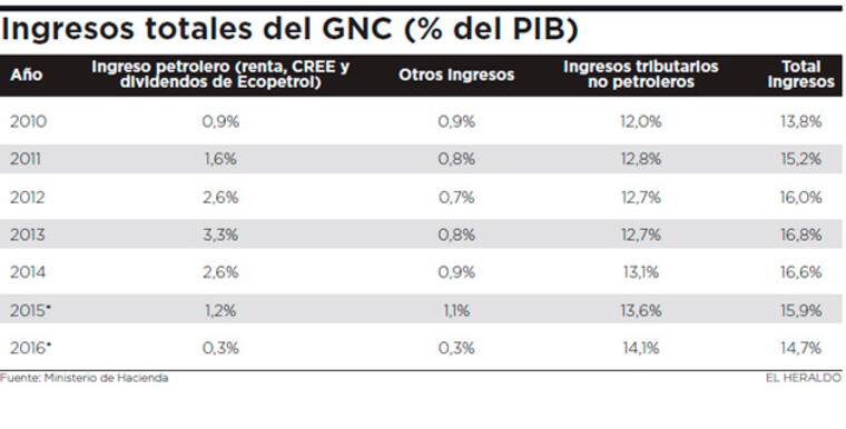 De acuerdo con datos del Ministerio de Hacienda, pese a que el ingreso petrolero ha disminuido 1,4% (de 3,3% a 2,6% del PIB) las medidas tomadas para diversificar el ingreso fiscal no lo hacen dependiente de las materias primas. En general, para 2015 del 15,9% del PIB que representaron los ingresos totales solo un 1,2% correspondió a ingresos petroleros, y para 2016, de los 14,9% del PIB esperado, solo un 0,3% corresponderá a estos ingresos.