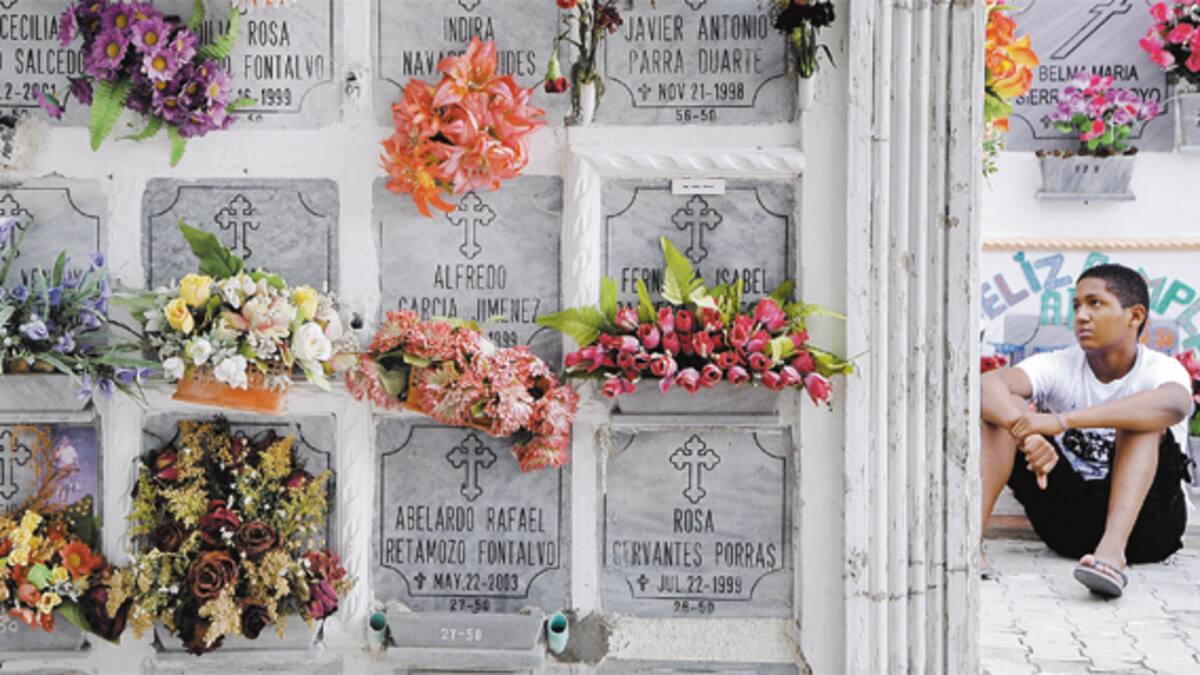 Unos metros al norte del cementerio, se intensifica el olor de las violetas recientes y de las rosas marchitas. Para conservar el adorno floral que ha colocado en la tumba de su marido, Flor Forero vierte por allí un conservante para flores en una botella con agua. Su hijo Jareth, de 5 años, intenta arrebatarle la botella de la mano para regar las flores. 'Es que él mismo es quien las coloca en la tumba', dice mientras acaricia al niño con la mirada.