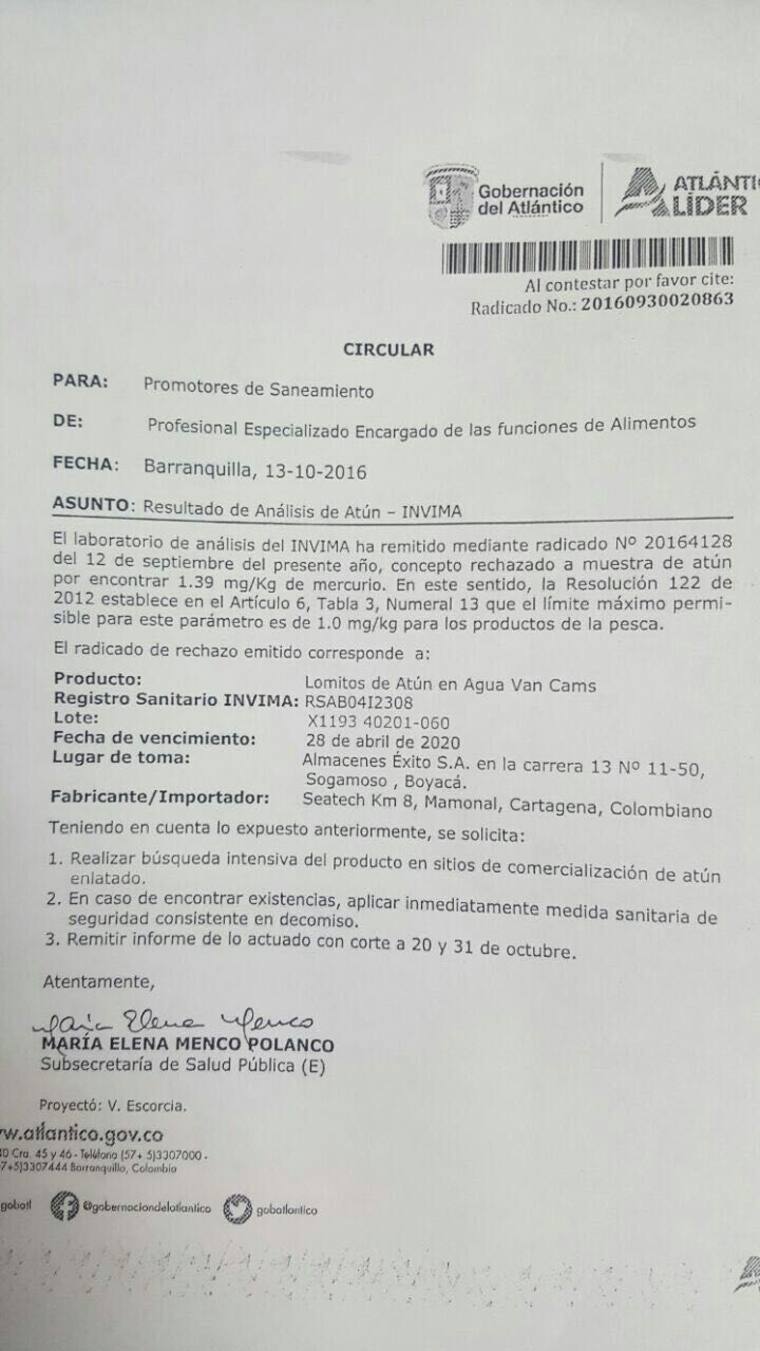 El oficio, fechado este 13 de octubre, advierte que el laboratorio de análisis del Invima ha remitido, mediante radicado 20164128 del 12 de septiembre pasado, un concepto de 'rechazado a muestra de atún por encontrar 1,39 mg/kg de mercurio'.