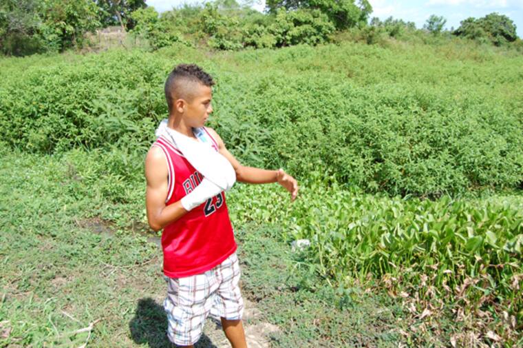 La mañana del martes se quedaría clavada en sus recuerdos y en su piel, incluso más profundo que la herida y la cicatriz que le dejó en su mano derecha el ataque de una babilla que lo sorprendió mientras lavaba sus pies en la orilla del jagüey que se encuentra justo enfrente de la ladrillera donde el niño de 13 años se rebusca de vez en cuando para colaborar con los suyos.