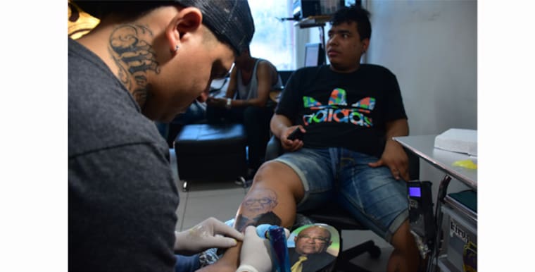 De repente, Pombo suelta una leve carcajada. Lleva dos horas observando el trabajo del tatuador. No se inmuta por el posible dolor que otra persona menos experimentada podría sentir. Este es el segundo retrato que estampa en su piel. El primero fue el del cantante de salsa, Héctor Lavoe, hace dos años. La razón de porqué se lo hizo es semejante a la de esta ocasión: admiración.